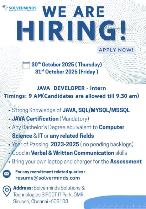 At Solverminds, we don’t just hire interns β€” we nurture innovators. If you’re a tech enthusiast eager to build a career in Java development, this is your moment. Bring your curiosity, commitment, and creativity β€” and let’s code the future together.